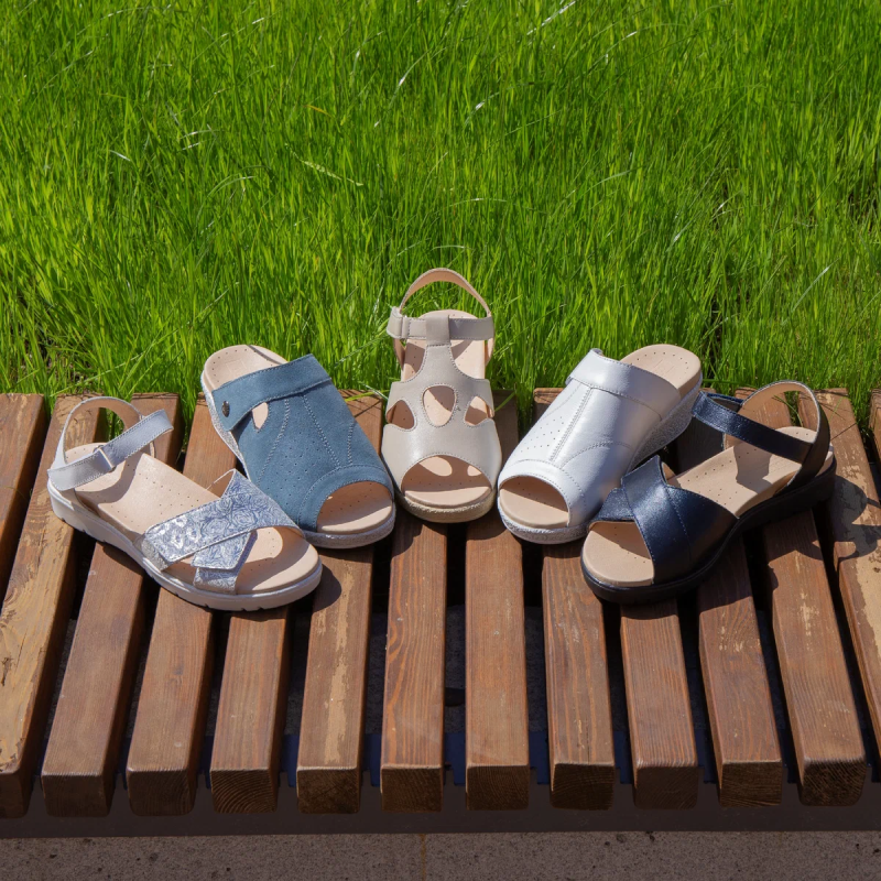 Летом из-за жары очень часто отекают ноги, особенно, если у вас есть проблемы с венами. При варикозе объём стопы в утреннее время и вечернее может различаться на 1-2 размера. Поэтому при подборе обуви важно выбирать пару, объём которой можно регулировать. Один из лучших вариантов - это застёжка «Велкро».