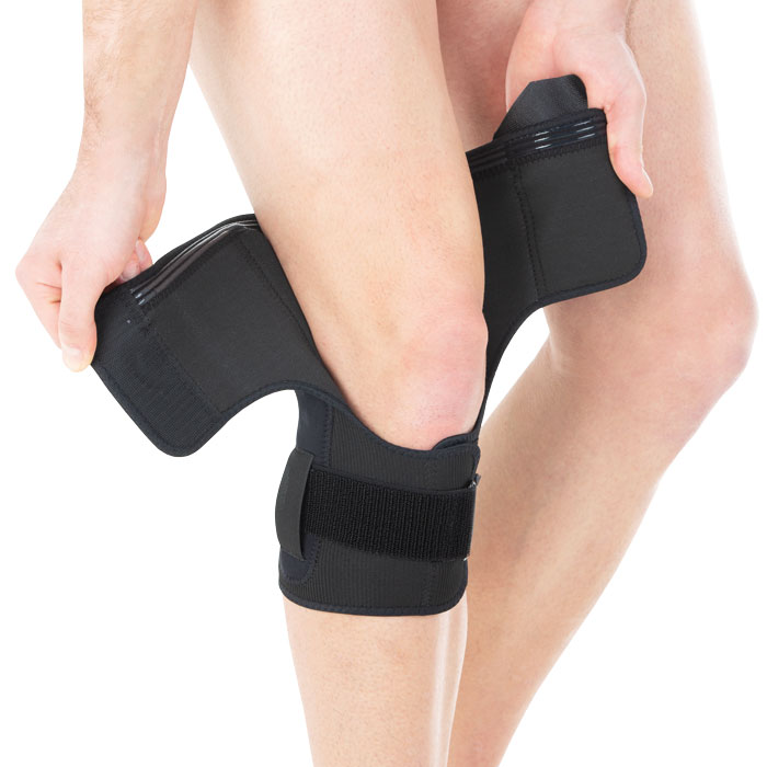 - При надевании изделия необходимо следить за тем, чтобы коленная чашечка была расположена в отверстии бандажа. Ребро жесткости должно располагаться чуть сзади от боковых осей коленного сустава