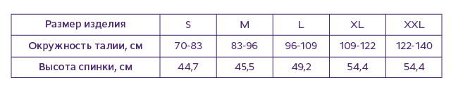 Для определения высоты изделия необходимо померьте высоту спины, измерив расстояние от C7 позвонка до L5 позвонка. Далее соотнесите рекомендованную высоту изделия и рост (мужской или женский). Полученный размер корректора (1, 2 или 3) соотнесите с окружностью талии, представленной в таблице.