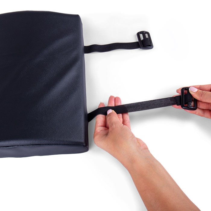 Расположить подушку в проекции поясничной области на сидении, более широкой частью книзу, закрепить верхний ремень через подголовник, нижние эластичные ремни продеть между спинкой и сидением кресла, отрегулировать удобное положение подушки в кресле